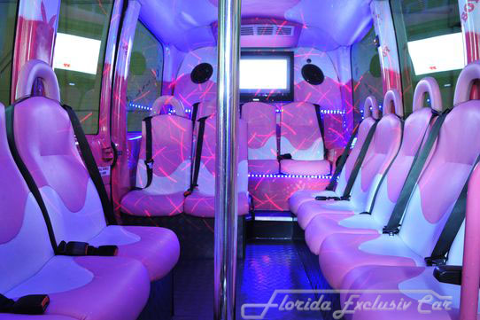 Außen extrem markant durch die schwarze Glanzlackierung mit einer speziellen Glitzeroptik, die dem Wagen eine besondere extravagante Note verleiht und chanchiert in diversen Farben Auffällig auch die 22 Zoll-Bereifung und die Lambodoors. Innen läßt dieser Dodge Charger von Florida Exclusiv Car an luxuriösen Interieur keine Wünsche offen. Im Fond des Fahrzeuges finden 8 Personen reichlich Platz auf den Ledersitzen. Die Mehrzonenklimatisierung sorgt auf Ihrer coolen Party, das es immer schön angenehm kühl bleibt, das Multimedia-System mit diversen Flachbildschirmen, Radio, CD- und DVD-Player, sowie ein Premium-Soundsystem lassen jede Art von Musik zum Erlebnis werden. Die riesige Spiegeldecke mit diversen Lichteffekten , wie zB. Sternenhimmel, Neonoptik, Lasershow, Strobelights und die endlos wirkende lange Bar lassen die Fahrt zum Erlebnis werden. Buchbar zB. als