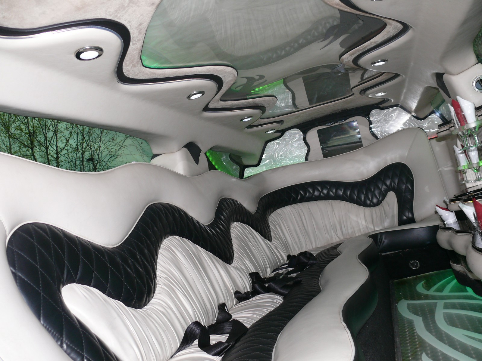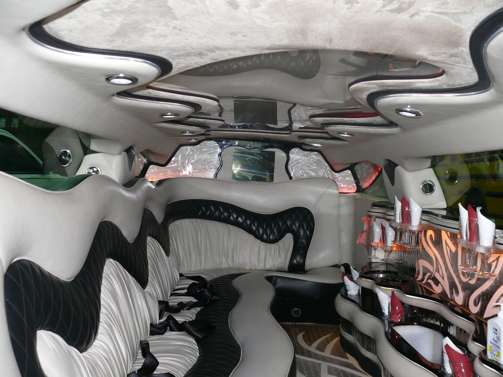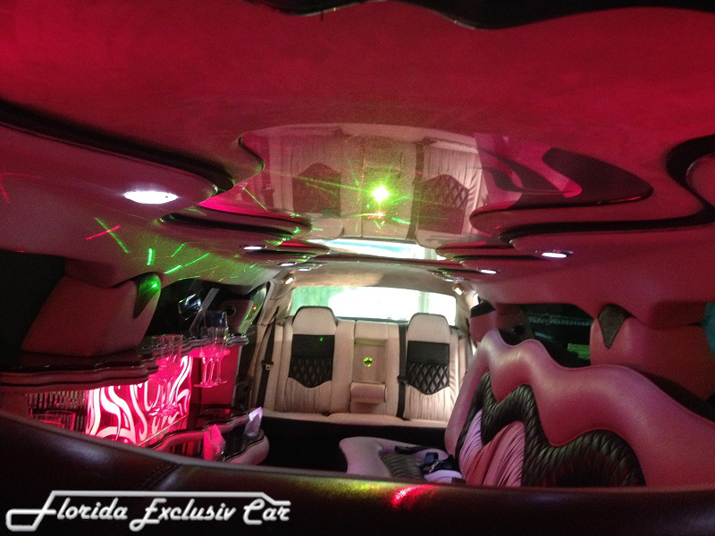Außen extrem markant durch die schwarze Glanzlackierung mit einer speziellen Glitzeroptik, die dem Wagen eine besondere extravagante Note verleiht und chanchiert in diversen Farben Auffällig auch die 22 Zoll-Bereifung und die Lambodoors. Innen läßt dieser Dodge Charger von Florida Exclusiv Car an luxuriösen Interieur keine Wünsche offen. Im Fond des Fahrzeuges finden 8 Personen reichlich Platz auf den Ledersitzen. Die Mehrzonenklimatisierung sorgt auf Ihrer coolen Party, das es immer schön angenehm kühl bleibt, das Multimedia-System mit diversen Flachbildschirmen, Radio, CD- und DVD-Player, sowie ein Premium-Soundsystem lassen jede Art von Musik zum Erlebnis werden. Die riesige Spiegeldecke mit diversen Lichteffekten , wie zB. Sternenhimmel, Neonoptik, Lasershow, Strobelights und die endlos wirkende lange Bar lassen die Fahrt zum Erlebnis werden. Buchbar zB. als