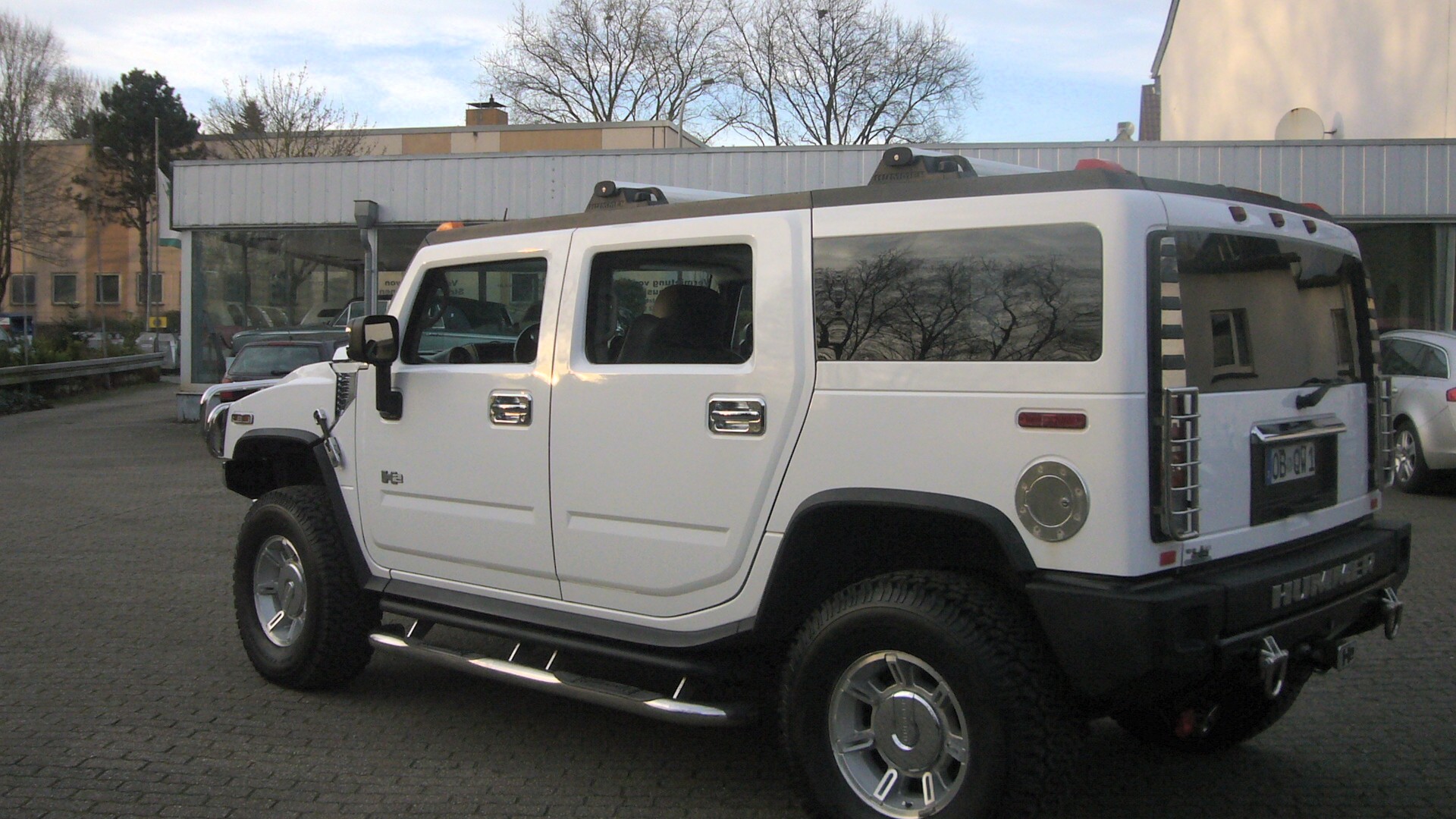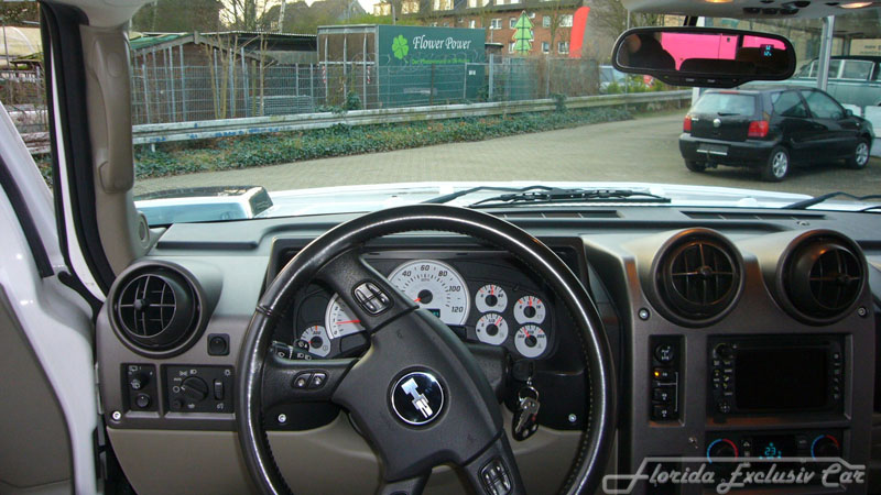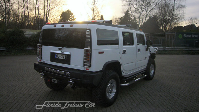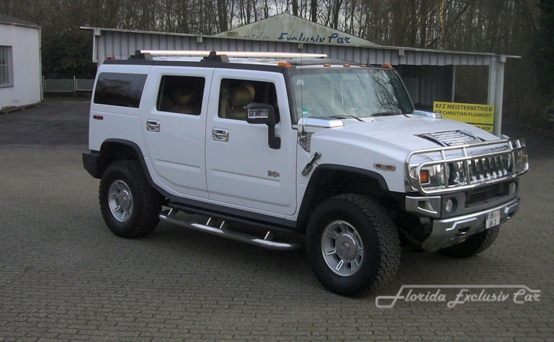 Der Gigant unter den Off-Roadern : Der Hummer H 2 mit rund 3 Tonnen „Lebendgewicht“ und Dein persönlichen Chauffeur warten auf Dich. Hier die Strassenversion in weiß. Hoch über den Köpfen der anderen Verkehrsteilnehmer, beeindruckt man die anderen Autofahrer mit dem riesigen Gefährt, mit dem man gelassen über unsere Strassen fährt.